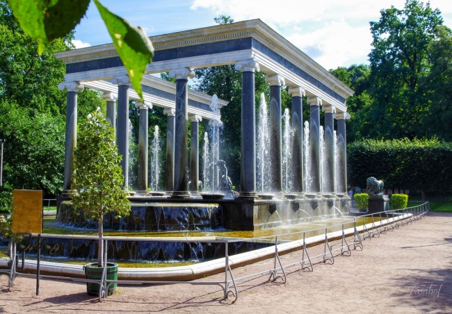 - Нижний парк — строгая планировка аллей и множество фонтанов