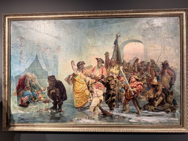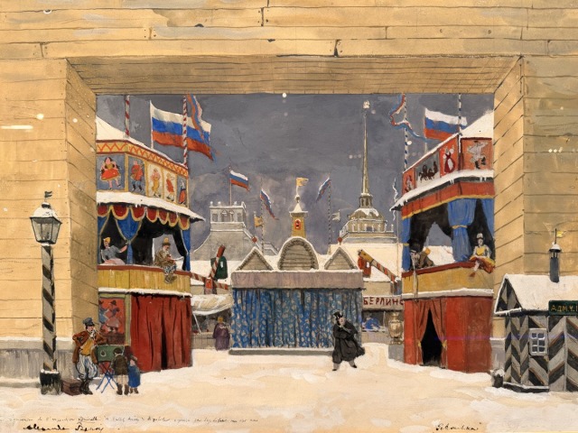 Мы пройдём по двум этажам экспозиции и встретим более 600 различных работ. Поговорим о талантливой семье Александра Бенуа, художниках круга «Мир искусства», Дягилеве и балетных, императоре Петре Первом и Петрушке. Манеж вас удивит: здесь ИИ соседствует с Леонардо, арапы — с шутами, Фаберже — с народным лубком, а на смену Версалю приходит Никола Ленивец.